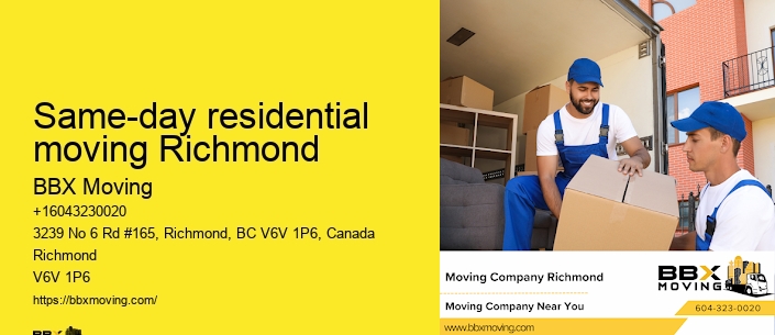 BBX Moving recognizes this growing demand in Same-day residential moving Richmond, and has responded by enhancing their storage solutions. Bubble wrap supplier BBX Moving's team is skilled in packing items of all sizes and shapes, ensuring they're secure for transit. You can reach out to us through our website, over the phone, or even stop by our office in person. Student moving services You won't face any surprises on moving day.